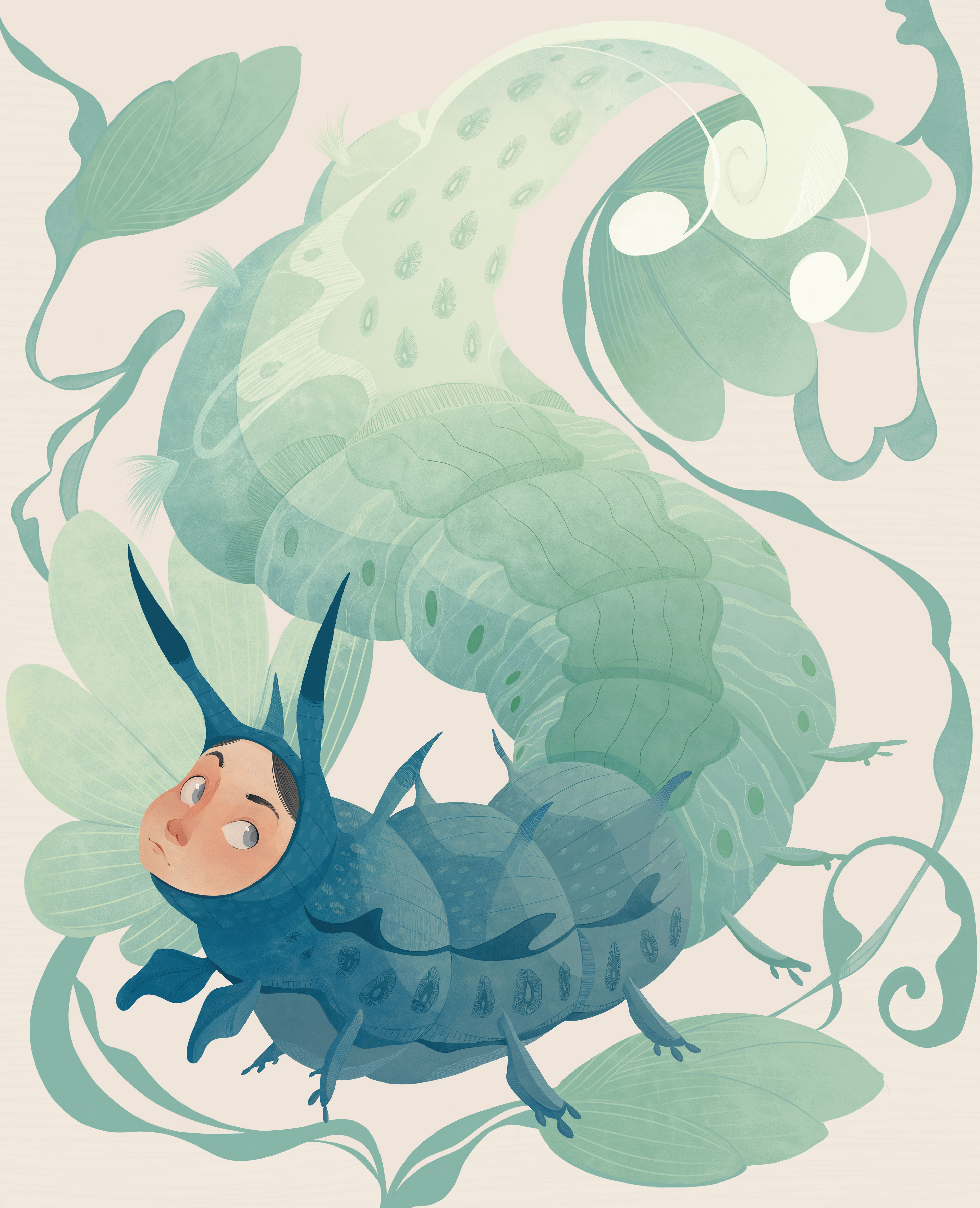 A series of illustrations based on the caterpillar, the chrysalis and the butterfly.